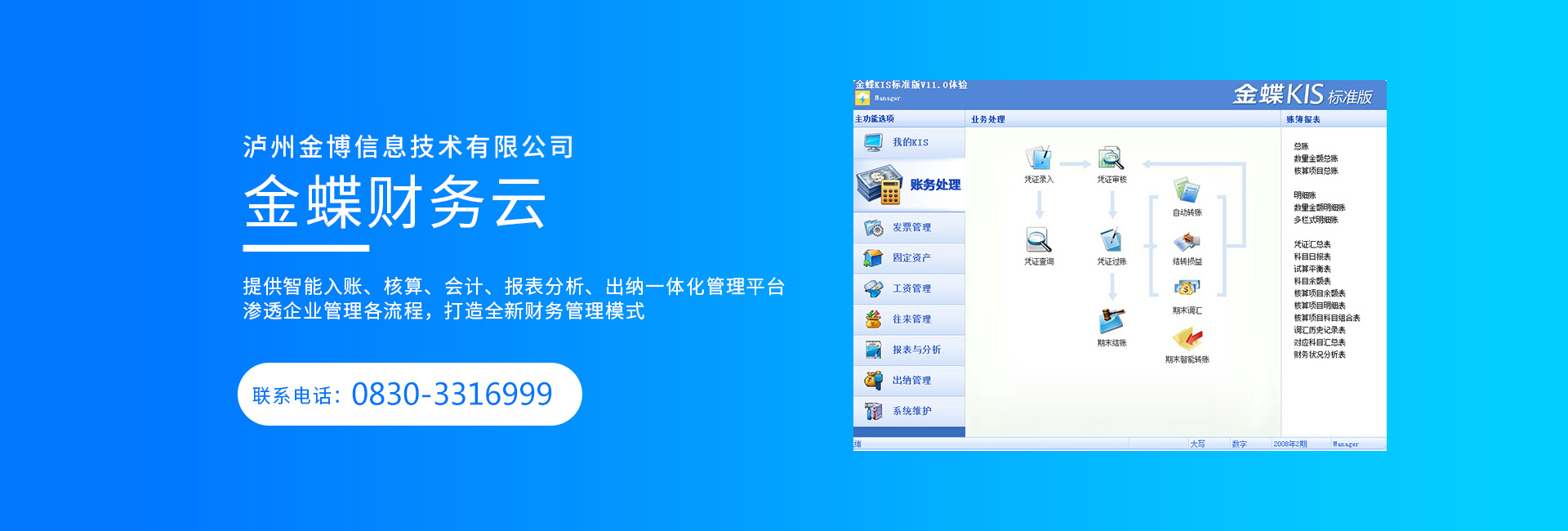 瀘州金博信息技術有限公司是金蝶軟件(中國)有限公司授權在瀘州地區從事金蝶軟件經銷和技術服務的專業軟件公司,公司自成立以來,在瀘州使用金蝶軟件的客戶已發展到3000余家,遍及全市、區、縣的機關事業單位和機械、化工、運輸、礦山、房地產、港口、酒業等各行各業,為他們在財務管理、物資管理、生產管理、辦公自動化、人力資源的信息化建設成功使用金蝶軟件提供了專業的技術服務。同時公...